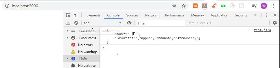 var oReq = new XMLHttpRequest(); oReq.addEventListener("load", function() { console.log(this.responseText); }); oReq.open('GET', "http://localhost:3000/json.txt");//parameter를 붙여서 보낼수있음. oReq.send();이렇게 작성하고, node app.js 명령어를 실행하면, 브라우저 콘솔창에 json.txt 를 잘 불러오는것을 확인할 수 있다