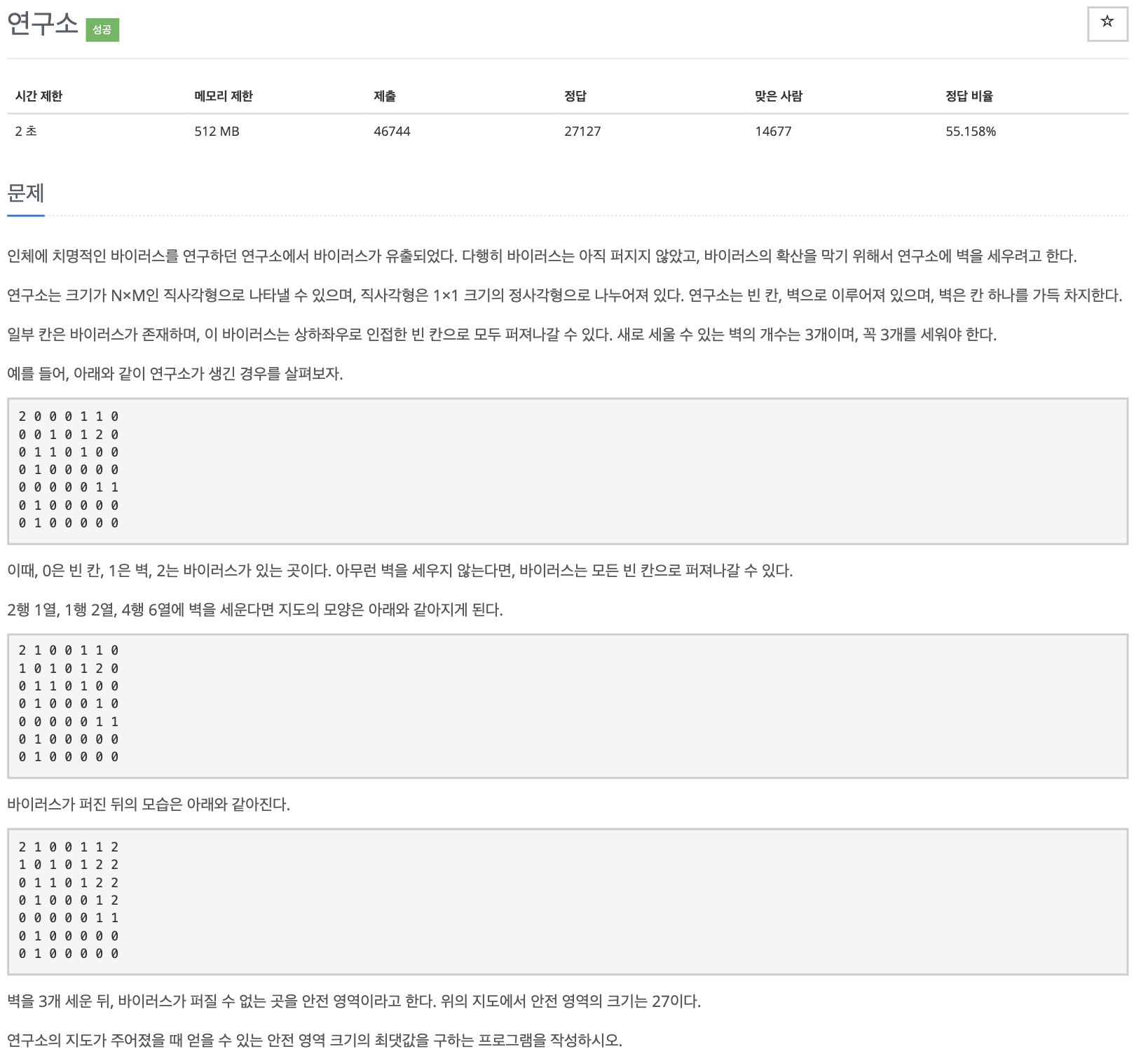 벽 3개를 추가로 세워서 바이러스가 퍼지지 않는 안전영역의 최대값을 구하는 문제이다.