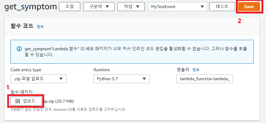 함수 패키지에 업로드 버튼을 눌러 zip.zip 파일을 업로드 해준다. 그리고 Save 버튼을 눌러 저장하는걸 잊지 말자.