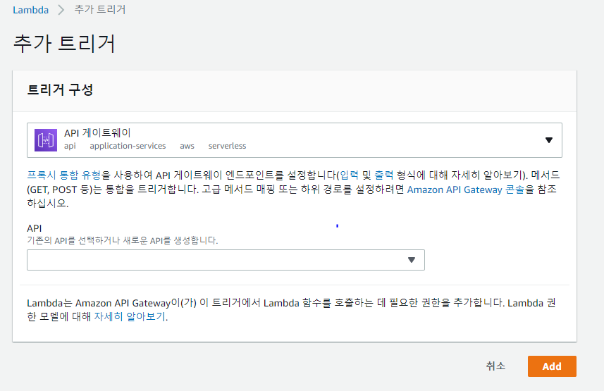 트리거 구성에서 API 게이트웨이 설정. 기존 API 가 있으면 그것을 설정해주고, 아니면 새 API 생성을 선택한다.