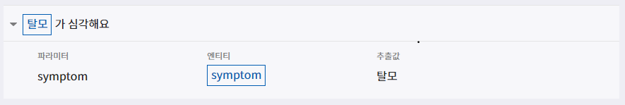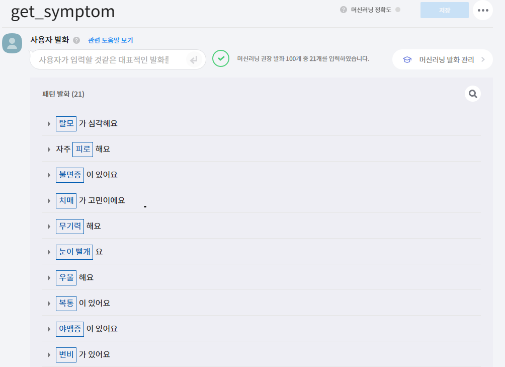 get_symptom 이라는 블록을 하나 만들고, 사용자 발화에 예상되는 발화들을 몇개 넣어주었다. 20개 이상 입력하면 머신러닝을 사용할 수 있다. 내가 받을 사용자 발화는 증상에 대한 내용이므로, 증상에 해당되는 단어를 엔티티로 태깅했다.