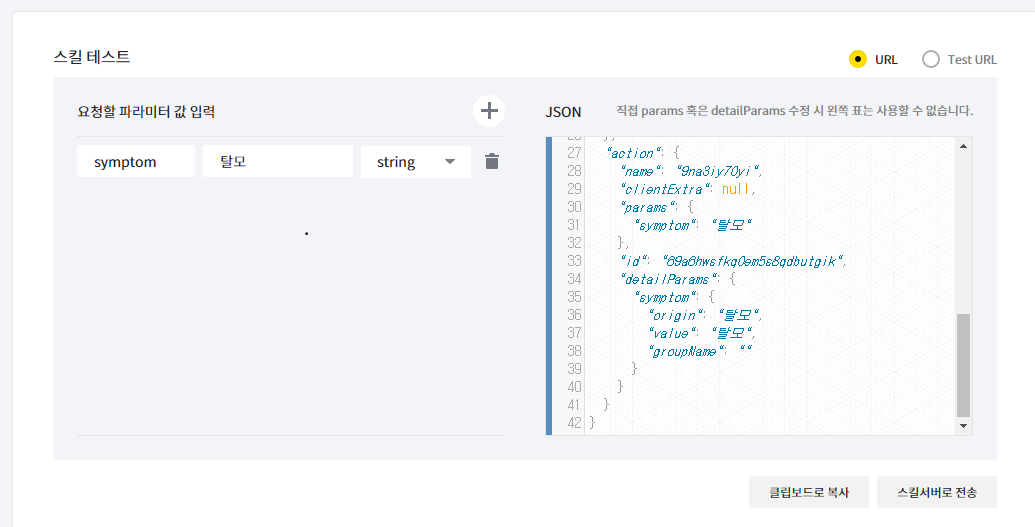 { "intent": { "id": "vx5bcjj48zgfghsofdomu50h", "name": "블록 이름" }, "userRequest": { "timezone": "Asia/Seoul", "params": { "ignoreMe": "true" }, "block": { "id": "vx5bcjj48zgfghsofdomu50h", "name": "블록 이름" }, "utterance": "발화 내용", "lang": null, "user": { "id": "135710", "type": "accountId", "properties": {} } }, "bot": { "id": "5e50c9488192ac0001584540", "name": "봇 이름" }, "action": { "name": "9na3iy70yi", "clientExtra": null, "params": { "symptom": "탈모" }, "id": "69a6hwsfkq0em5s8qdbutgik", "detailParams": { "symptom": { "origin": "탈모", "value": "탈모", "groupName": "" } } } }시나리오에서 블록을 생성하고, 결과값이 잘 출력되는지 확인