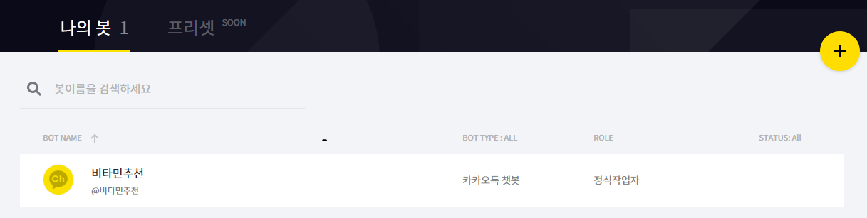 권한이 인정되면, 이렇게 나의 봇에 챗봇이 하나 보일것이다. 기본적인 준비는 이것으로 끝이다.