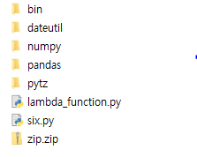 Unable to import module 'lambda_function': Missing required dependencies ['numpy']엥? numpy 가 빠졌다고? pandas 라이브러리는 numpy 를 포함하고 있다. 아까 압축했던 디렉토리를 보면, numpy 도 설치되었던 것을 확인할 수 있다.