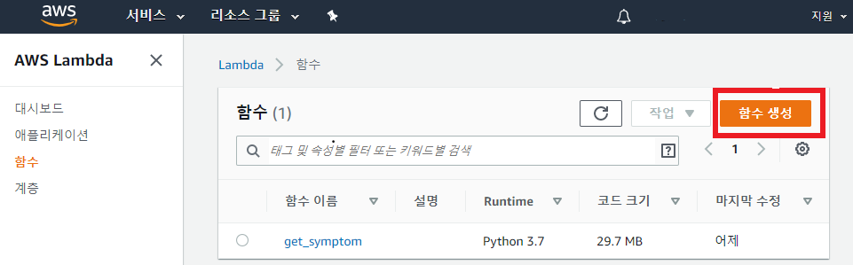 함수 이름과 런타임을 적는다. 나같은 경우에는 python3.7 을 넣었다. 그리고 함수 생성 버튼을 누른다.