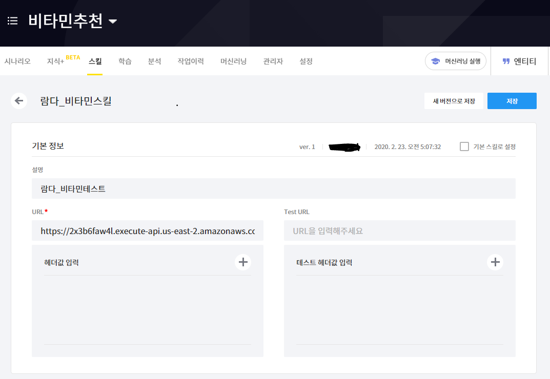 스킬 메뉴에서 스킬을 생성하고, 아까 배포한 API URL 을 입력해준다. 만약 API 키를 설정하였으면, 헤더값에