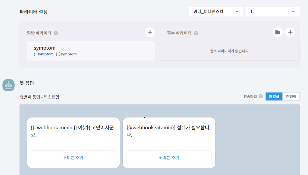 봇 응답에서 result 로 넘겨준 값들을 {{#webhook.<json_path>}}의 표현으로 설정해준다.